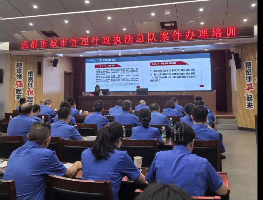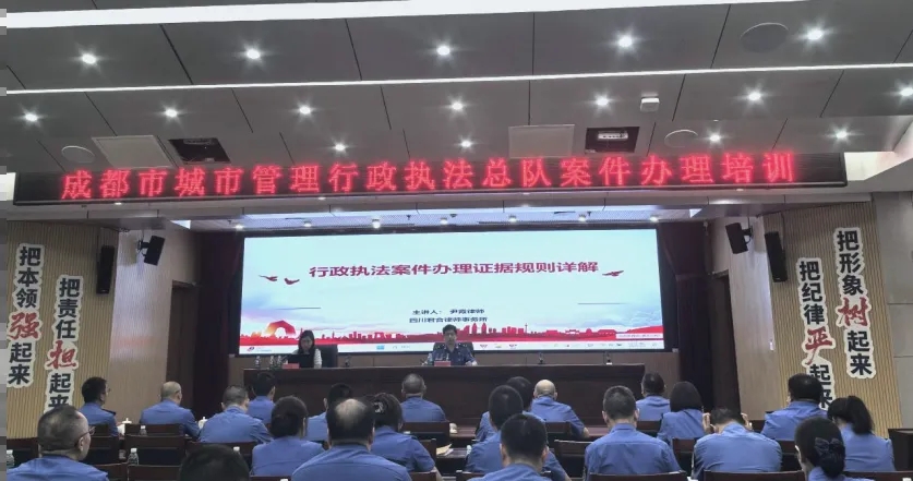 2025年9月9日,根据成都市城市管理行政执法总队的年度培训计划安排,四川君合律师事务所尹霞律师应邀在总队六楼会议室开展了《行政执法案件办理证据规则详解》专项法律培训。成都市城市管理行政执法总队主要领导、各大队大队长、副大队长等关键岗位执法人员悉数参与了本次培训。