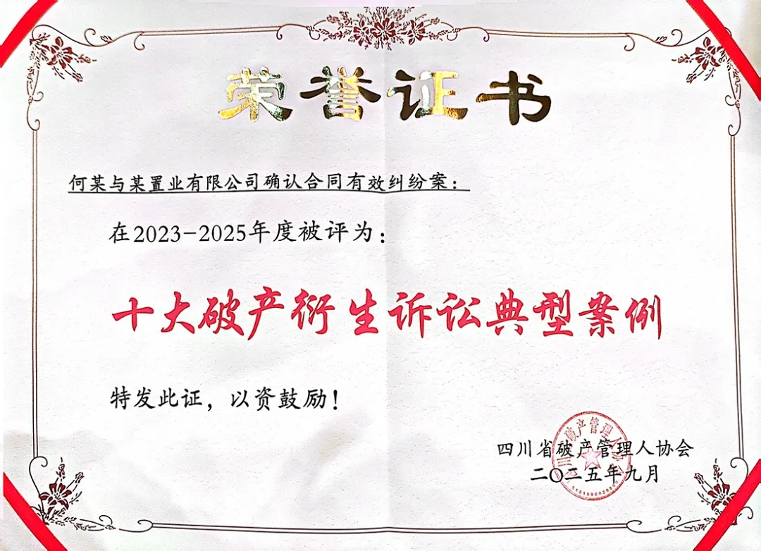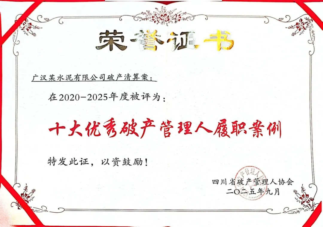 根据《四川省破产管理人协会关于开展2020—2025年度评优评先活动的通知》(以下简称《通知》)要求,为表彰在破产管理实务、理论研究及协会事务中表现突出的团体与案例,充分发挥先进典型示范引领作用,四川省破产管理人协会开展评优评先工作。我所凭借在破产领域扎实积累和优异表现获评“2020—2025年度优秀会员”,我所承办的“何某与某置业有限公司确认合同有效纠纷案”荣获“2023-2025年度十大破产衍生诉讼典型案例”,我所承办“广汉某水泥有限公司破产清算案”荣获2020-2025年度十大优秀破产管理人履职案例。