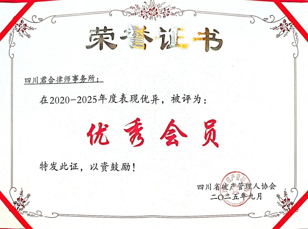 四川君合律师事务所获评四川省破产管理人协会“2020-2025年度优秀会员”等多项荣誉