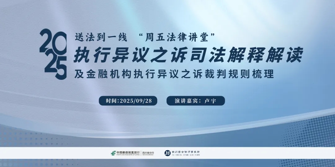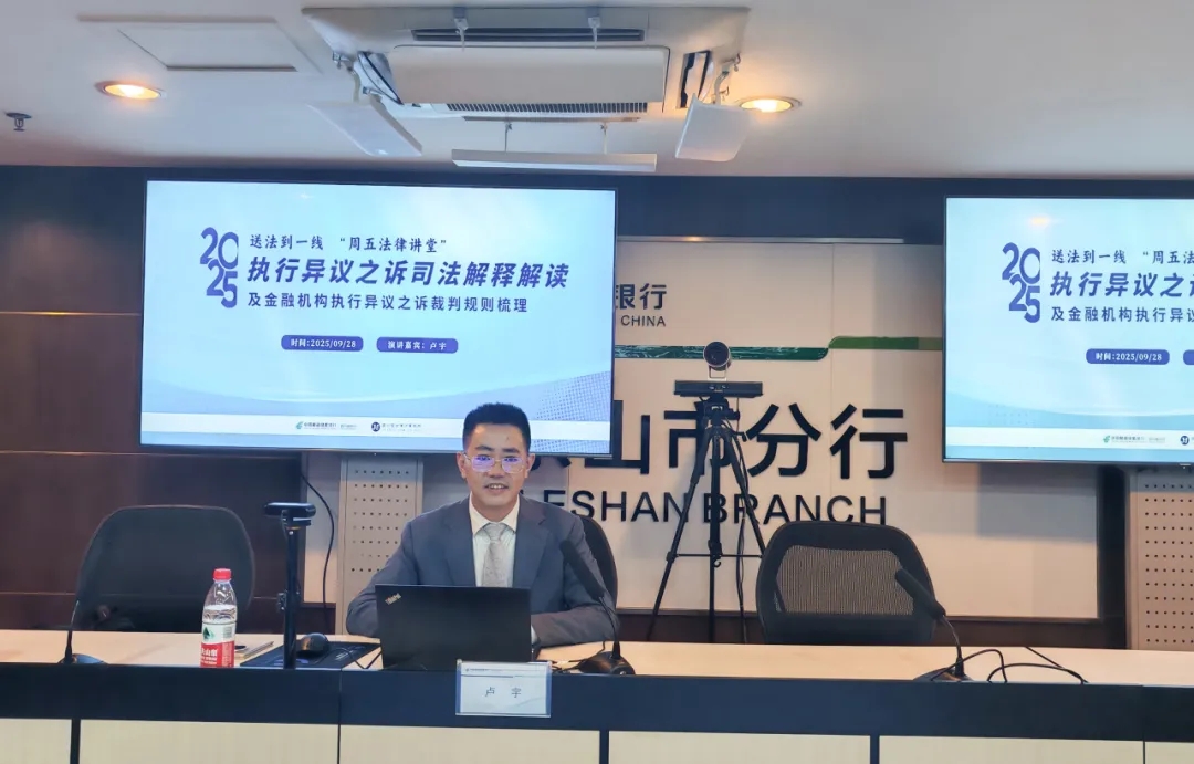 2025年9月28日下午,我所高级合伙人卢宇律师为中国邮政储蓄银行股份有限公司四川省分行做《执行异议之诉司法解释解读及运用》讲座。本次讲座在邮储乐山分行举行,邮储银行在川各分支行分管领导、各部门负责人、业务骨干及法律与合规部工作人员通过现场和网络直播方式聆听讲座。
