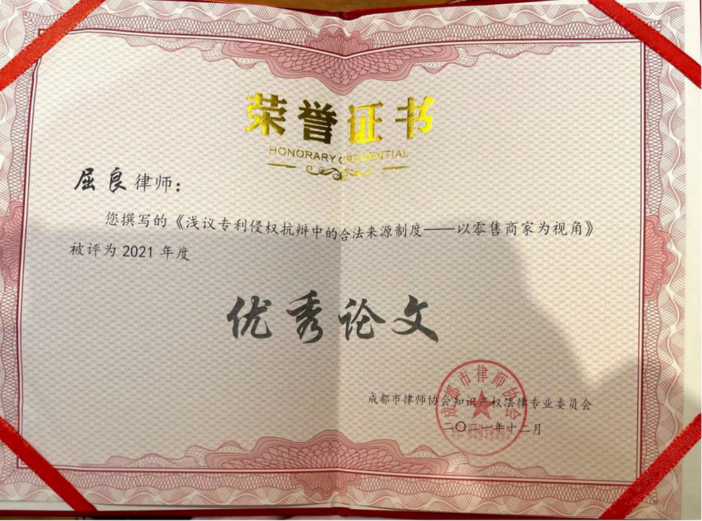 2021年12月11日,成都市律师协会知识产权法律专业委员会举办了2021年年会暨知识产权惩罚性赔偿培训上,会议上,我所专职律师、专利代理师屈良撰写的《浅议专利侵权抗辩中的合法来源制度——以零售商家视角》被评为年度优秀论文。
