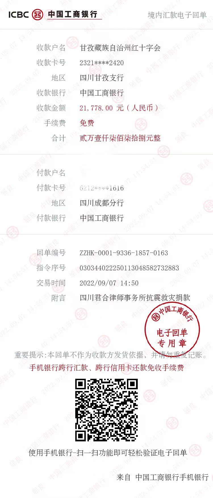 2022年9月7日,一笔饱含着四川君合律师事务所广大党员、律师爱心和深情厚谊的汇款汇往四川省甘孜藏族自治州红十字会。