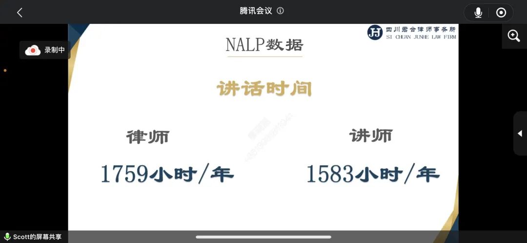 王老师以一组“律师”和“讲师”讲话时长的数据对比开场,引入了本期培训主题——“演讲力,青年律师的秘密武器”。