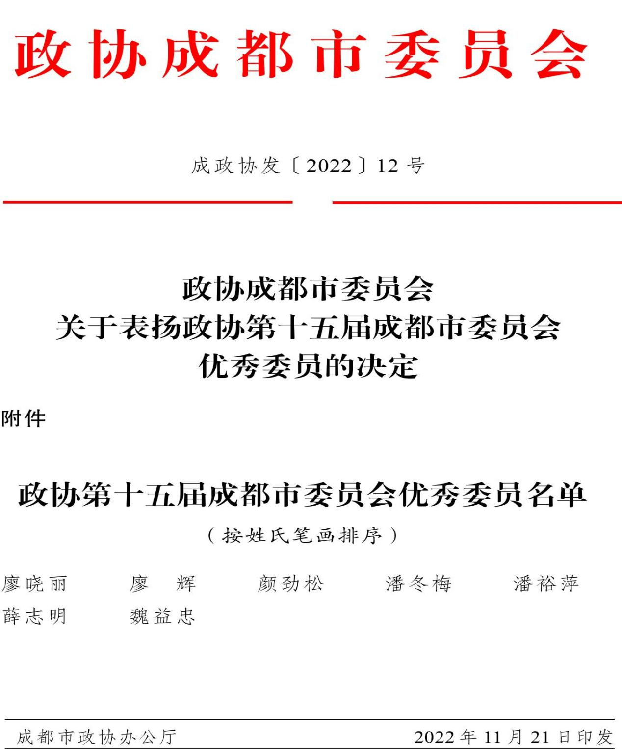 2022年11月18日,政协成都市委员会通报表彰了182名政协第十五届成都市委员会优秀委员,我所高级合伙人、副主任廖晓丽律师荣获优秀委员表彰。