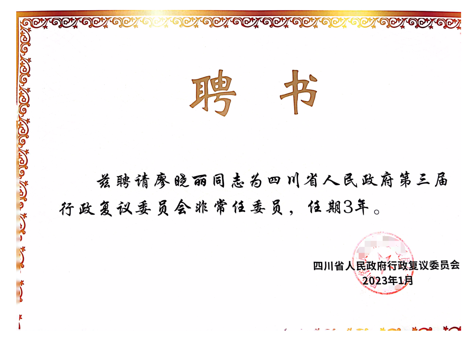 我所副主任廖晓丽律师受聘为四川省人民政府第三届行政复议委员会非常任委员。廖律师表示,任职期间将认真积极履职,发挥律师专业优势,做好本届行政复议案件审理工作。