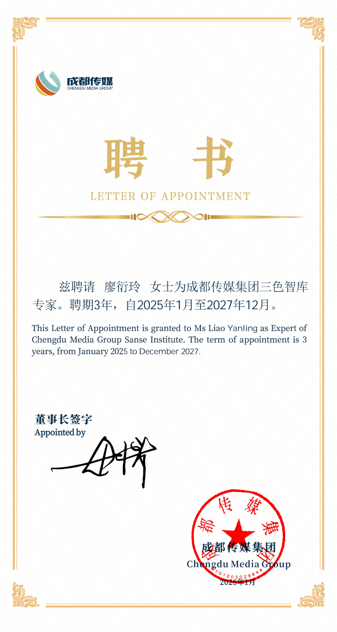 另外, 2025年1月,廖衍玲律师还获聘为成都传媒集团三色智库专家,聘期三年。