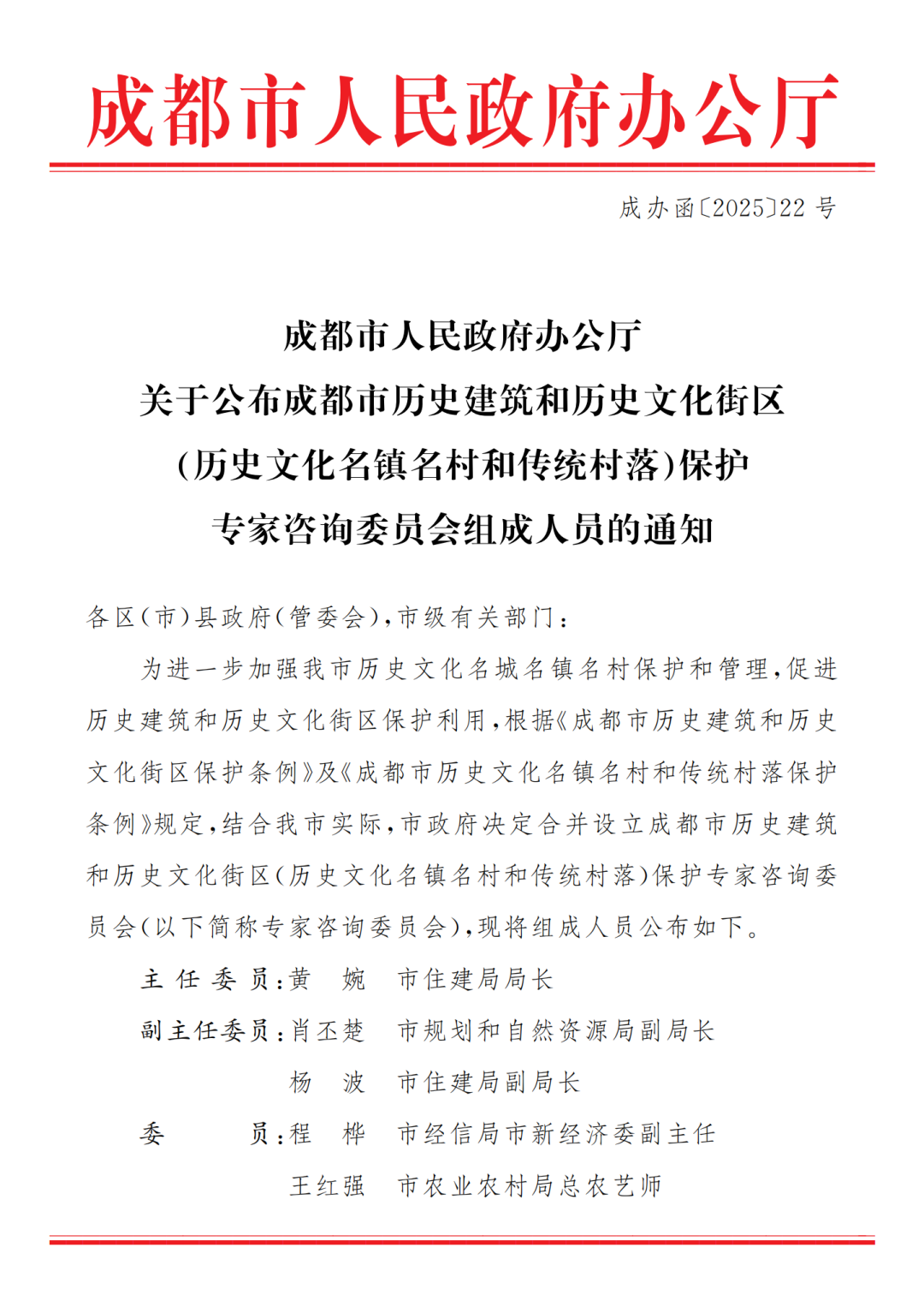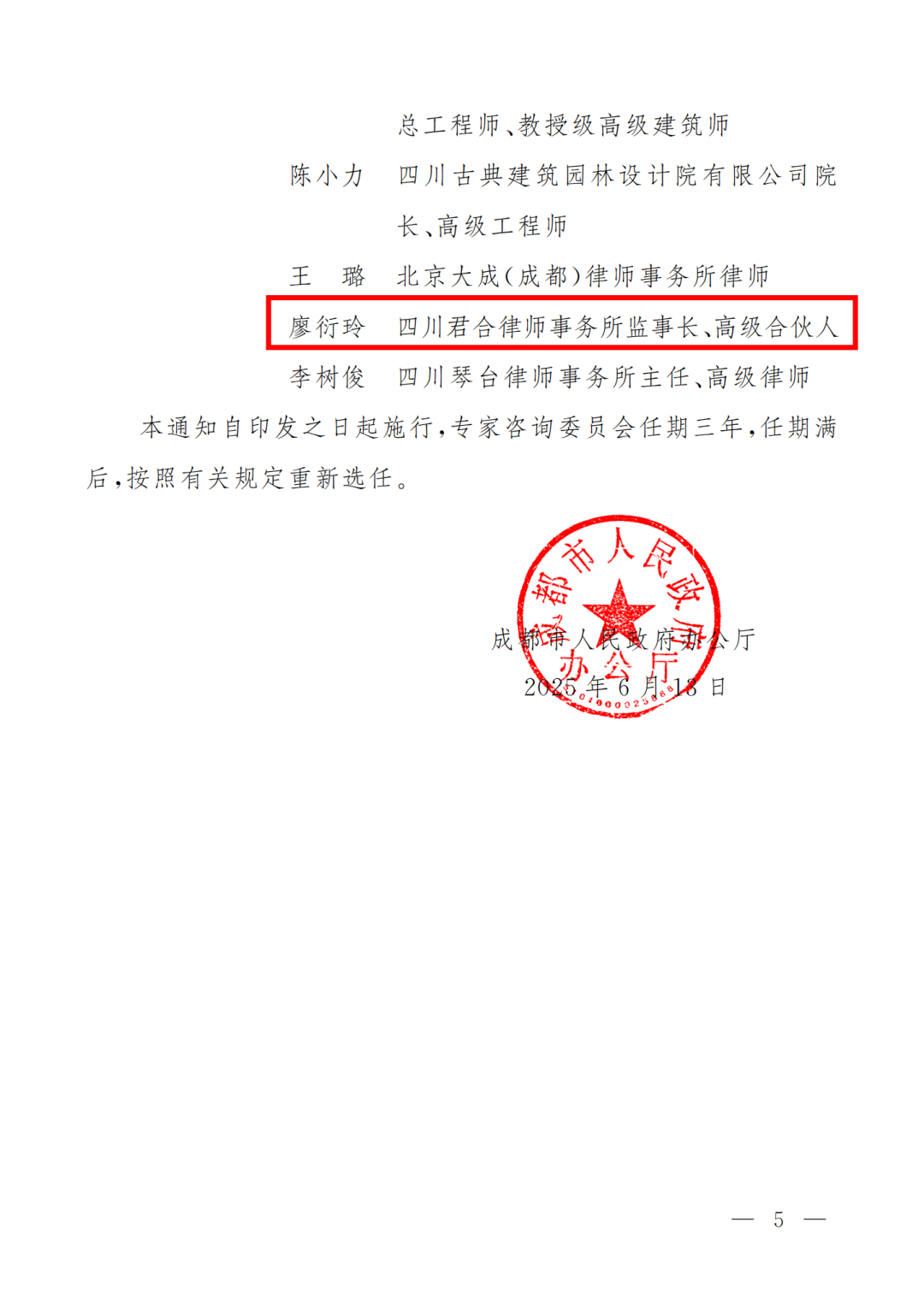 2025年6月13日,本所高级合伙人廖衍玲律师获聘成都市历史建筑和历史文化街区(历史文化名镇名村和传统村落)保护专家咨询委员会委员,任期三年。